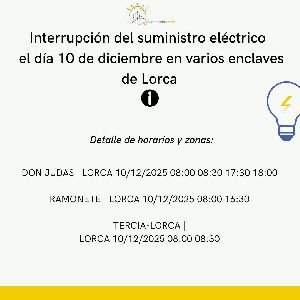 – Tercia-Lorca, Lorca, 10 de diciembre de 2025, de 08:00 a 08:30 en Cl Tercia 32PC, Cn De Churra 10.10 2.12, 1,14,18,3,9, Cl. Vereda Zamora, 1,10,127,16,18,2,20,22,3,31, PC,4,5,6,7,7 A,8, Cn Puente Churra 11.11A,16.7, Cn Vereda La Palma, 32,34,349,35,35, CP,353,36,37,38,39,41,43, PR,45,45 1,47,49,49 1,51,55,80.