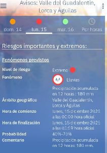 El Ayuntamiento de Lorca ha informado que debido al aviso de riesgo de Nivel Rojo por lluvias y tormentas muy fuertes establecido por AEMET, el Plan INUNLOR ha evolucionado al Nivel 1 de preemergencia. Se insta a la población a extremar la precaución, evitar desplazamientos innecesarios, no cruzar bulevares o zonas inundables y seguir siempre las indicaciones de los servicios de emergencia. La Agencia Estatal de Meteorología ha emitido un aviso ROJO para hoy, 15 de diciembre, por riesgo de lluvias desde la medianoche hasta las 05:59 para el Noroeste, Valle del Guadalentín, Lorca y Águilas. Se espera una precipitación acumulada en 12 horas de 180 mm, con una probabilidad de 40%-70%. Toda esta información ha sido proporcionada por AEMET.