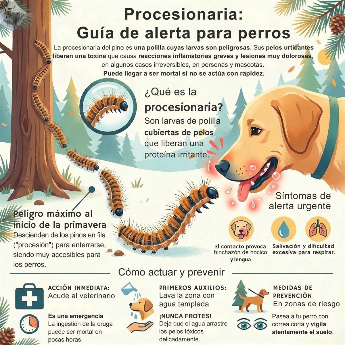 Como resultado de esta situación, varios perros han necesitado atención veterinaria en distintas clínicas de la región. En los últimos días, se han avistado orugas de procesionaria en el suelo en diversos puntos de la zona, con observaciones esporádicas de procesiones.